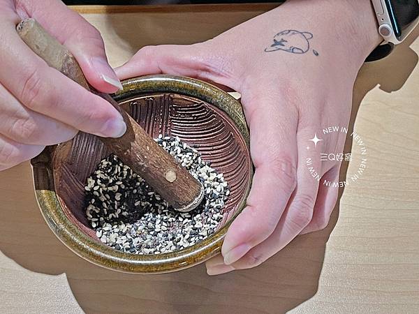 自己慢慢磨,咬著豬排感受口中散發著芝麻迷人的香味