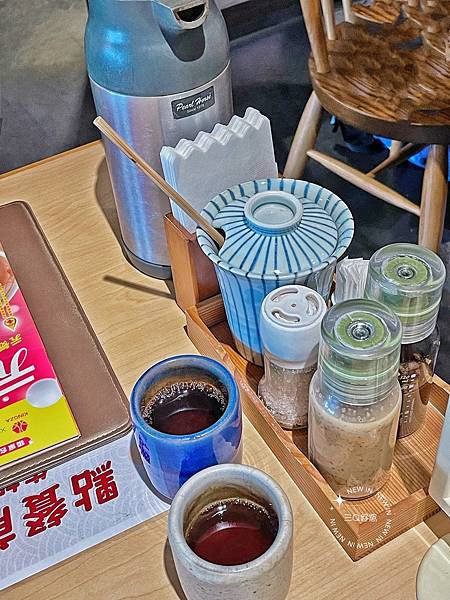 桌邊就有熱水壺與豬排醬、沙拉醬、玫瑰鹽……